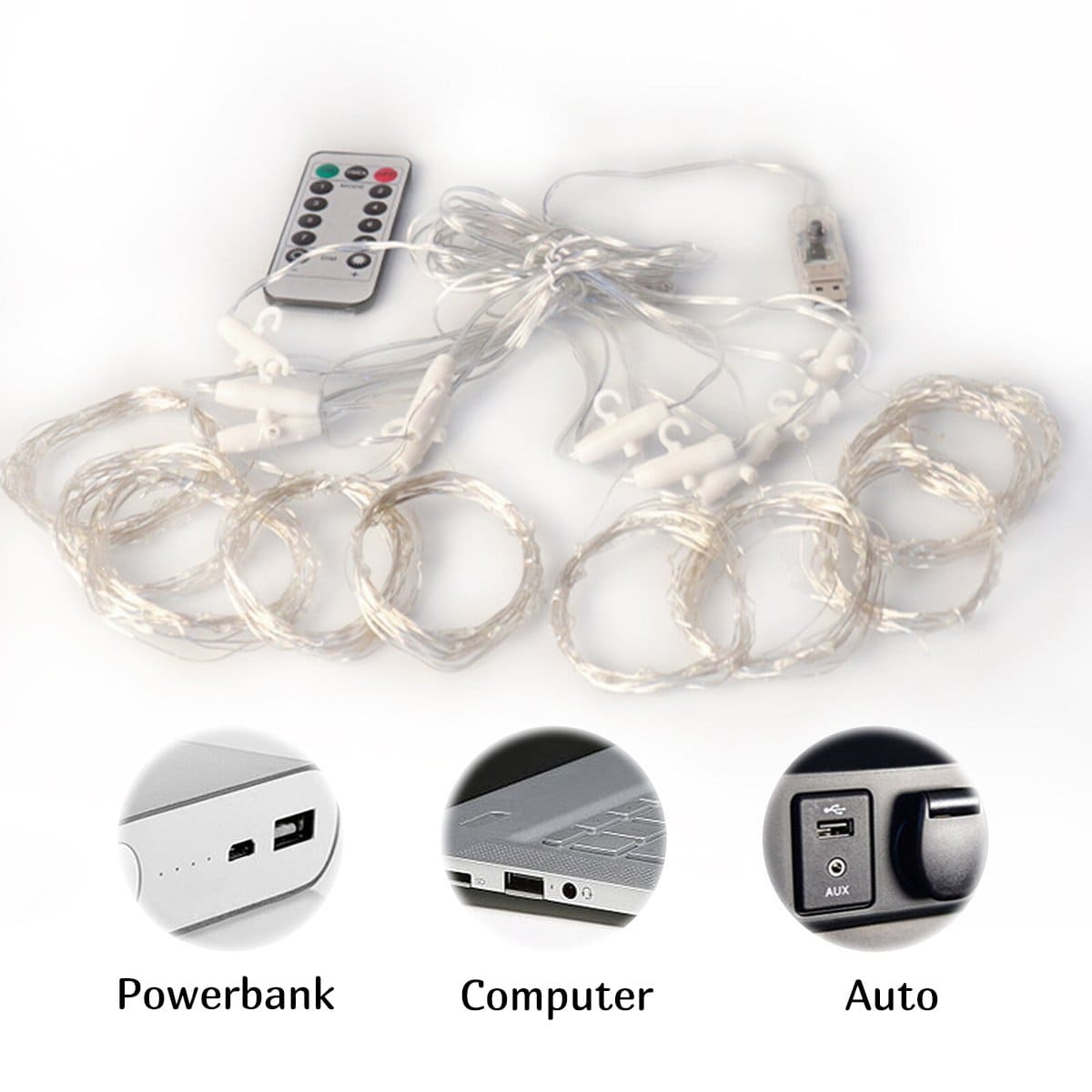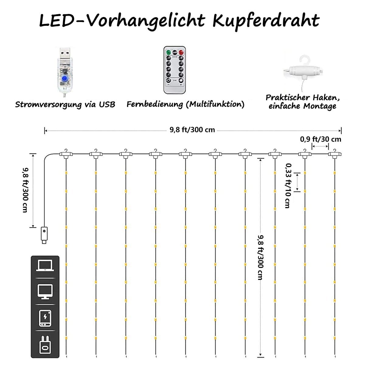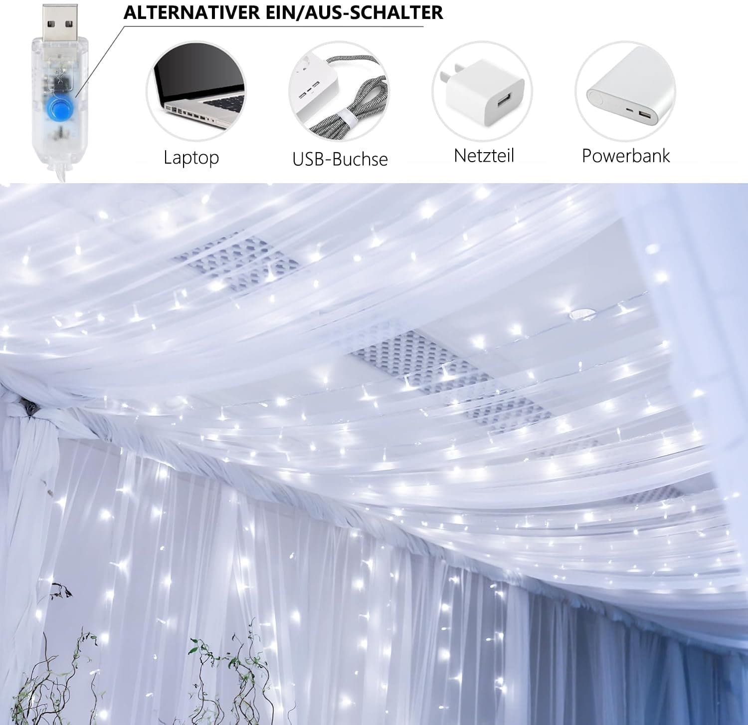 Unsere Lichterketten für Vorhänge werden mit 10 Haken zum Aufhängen geliefert. Sie eignen sich für jeden beliebigen Ort: Fenster, Vorhänge, Himmelbetten, Schlafzimmer, Weihnachten, Partys, Hochzeiten, Wohnungen, Gärten, Terrassen usw.