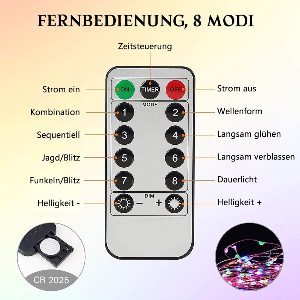 Verschönern Sie Ihre Festtagsdekoration mit unseren vielseitigen Lichterketten, die über 8 faszinierende Modi verfügen: Dauerlicht, Kombination, Wellen, Sequenziell, Langsam ansteigend, Lauflicht/Blinken, Langsames Ausblenden und Funkeln/Blinken.