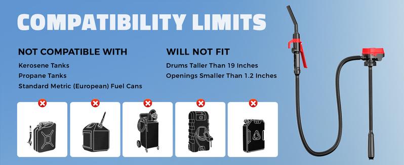 Includes three universal adapters (2.0", 2.5", 2.75") that fit most North American fuel cans and drums, making it the perfect gas pump for gas can setups. The 51-inch reinforced hose is flexible, rustproof, and leak-resistant, ensuring smooth, mess-free fueling every time.