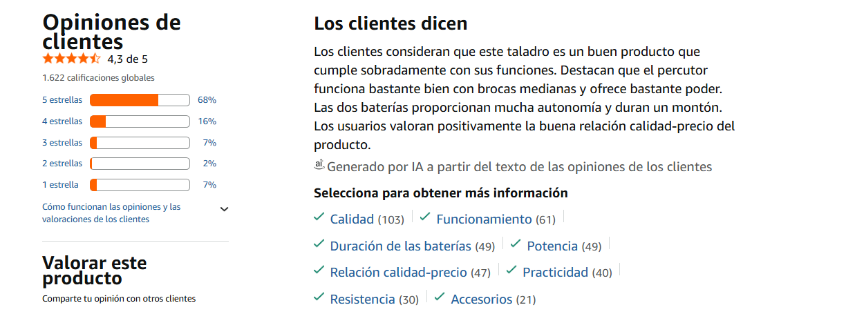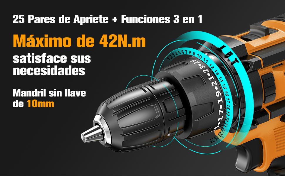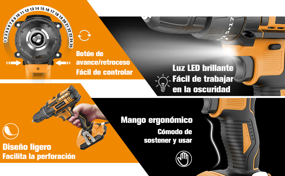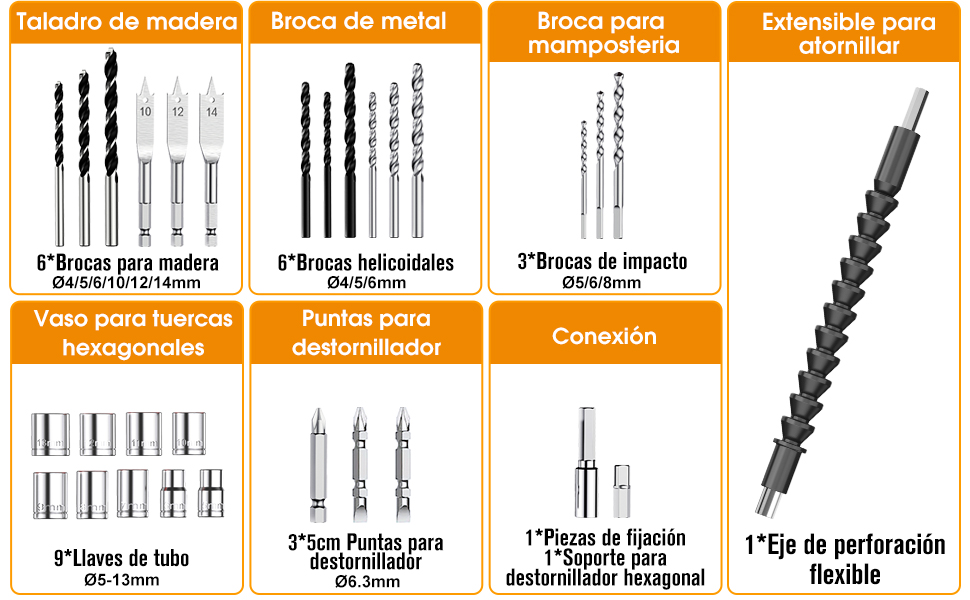 | Componentes incluidos | 1 taladro inalámbrico, 2 baterías 2,0Ah, 1 cargador, 1 estuche de transporte, 6 brocas para madera, 6 brocas helicoidales, 3 brocas de impacto, 3 puntas para destornillador, 1 eje de perforación flexible, 9 llaves de tubo, 1 broca de sujeción, 1 soporte para destornillador hexagonal, 1 clip para cinturón |
