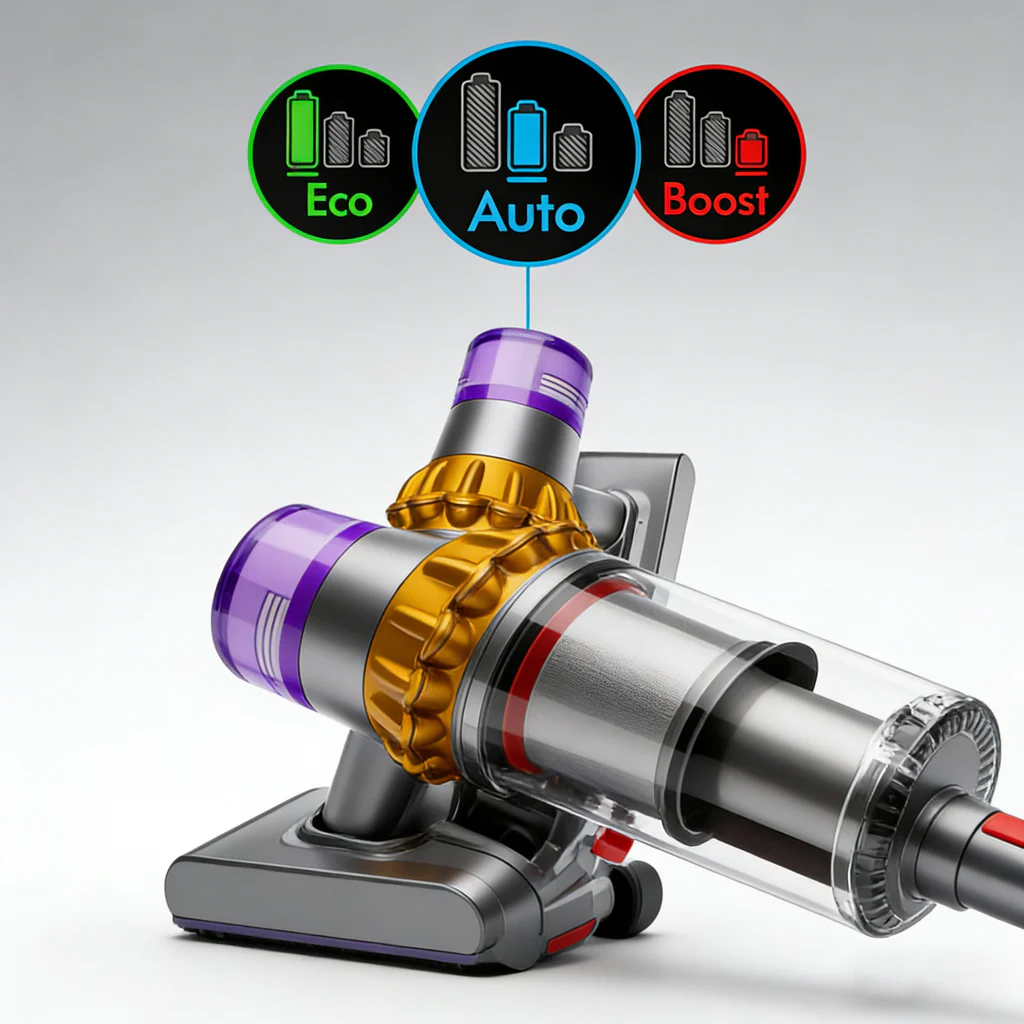 Auto mode for the optimum balance of power and run time. Eco mode for longer run times. Boost mode for short, intensive cleaning.