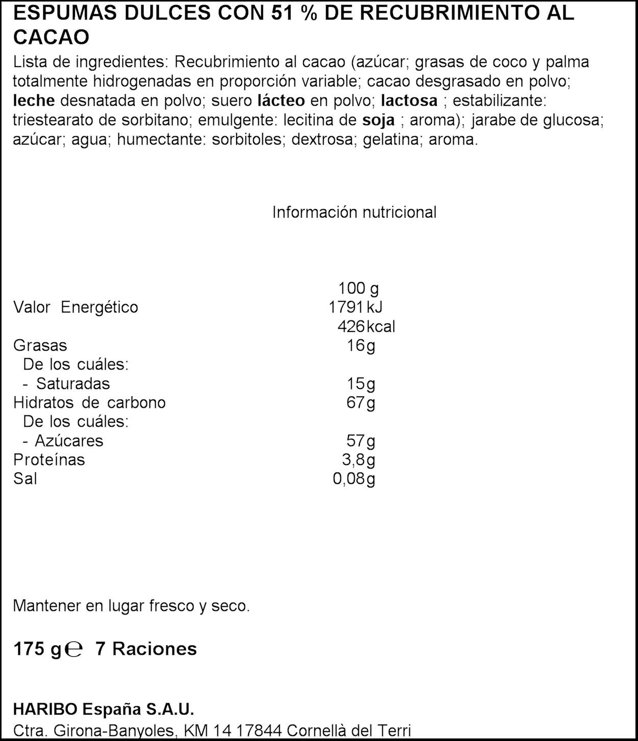 Recubrimiento al cacao (azúcar; grasas de coco y palma totalmente hidrogenadas en proporción variable; cacao desgrasado en polvo; LECHE desnatada en polvo; suero LÁCTEO en polvo; LACTOSA; estabilizante: triestearato de sorbitano, emulgente: lecitina de SOJA; aroma); jarabe de glucosa; azúcar; agua; humectante: sorbitol; dextrosa, gelatina; aroma.