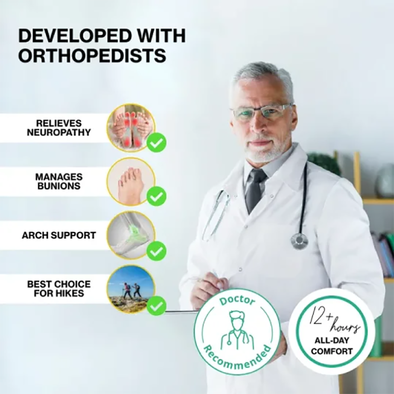 Our premium insoles, featuring anatomical arch support help improve foot and leg alignment, eliminate the Pain caused by flat feet, poor walking posture & plantar fasciitis.