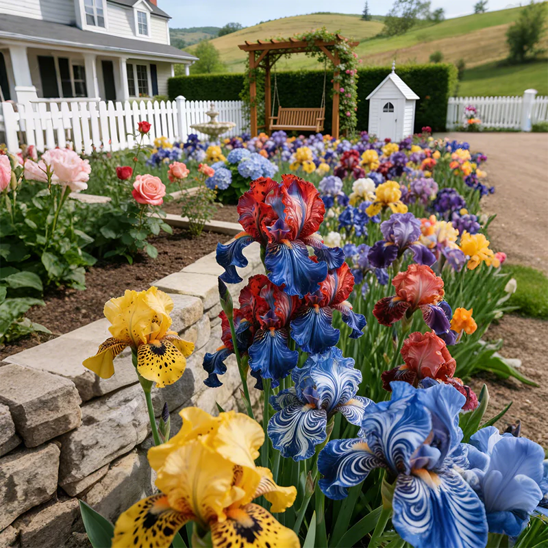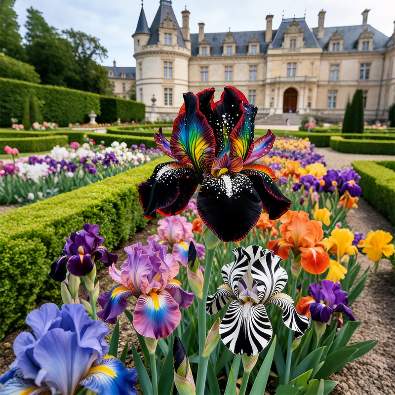 Carefully selected iris cultivars known for bold color contrasts and intricate petal patterns.