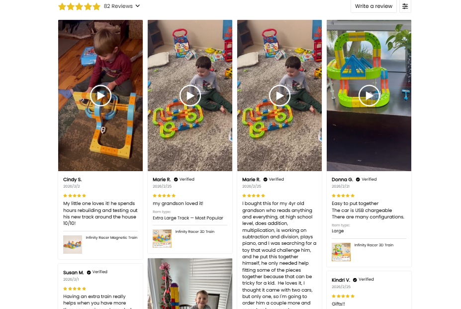 Verified Customer:As a mom of a toddler, I love that the track pieces are soft-edged and snap together easily. No small parts, no stress — just pure, safe fun.