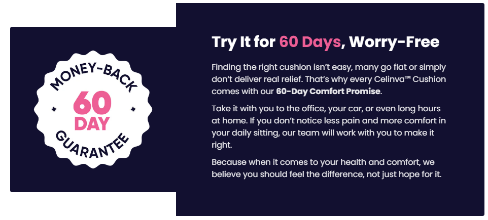 With input from orthopedic experts and months of ergonomic testing, the Celinva™ Cushion was designed to relieve the most frequent pain issues caused by long sitting from tailbone pressure to lower back and hip discomfort.