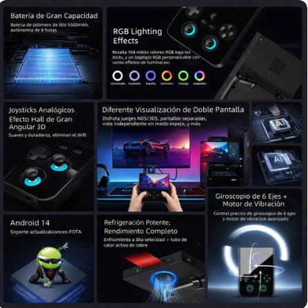 Esta consola funciona con el sistema operativo Android 14 y admite actualizaciones FOTA. Para mantener un rendimiento máximo durante sesiones intensas, incluye un potente sistema de refrigeración con ventilador de alta velocidad y tubo de calor activo. Además, cuenta con una batería de 5.500 mAh que ofrece hasta 8 horas de autonomía.