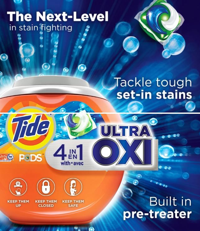 Tide PODS Liquid Detergent Pacs 4-in-1 Ultra Oxi 104 Count. How can something so small be effective against such old, set-in stains? The answer is simple: because it's Tide. Tough stains can easily scare some people, even causing them to throw away their clothes, thinking they're beyond saving. Tide PODS Liquid Detergents + Ultra Oxi were developed specifically for these situations: to remove the toughest stains. With built-in pre-treatments, Tide PODS Ultra Oxi lets you unleash your Tide can against these stains and make your day so much easier by taking these heavy chores off your shoulders. Tough stains aren't too tough for Tide; the proof is in the results. Its amazing quality is in the details: it's a 4-in-1 laundry solution with detergent, stain remover, color protectant, and built-in pre-treatments to tackle next-level stains. The special film allows the multi-chamber technology to dissolve in both hot and cold water, while the fast-collapse Smart Suds target tough stains. Tide PODS Ultra OXI works in HE washing machines as well as standard top-loading and front-loading washing machines. Because this special film dissolves in water, always handle PODS with dry hands and remember to add the Tide POD to the washing machine drum before adding clothes. For optimal performance, add two Tide PODS packs to the washing machine drum before adding laundry. Use one laundry pack for small/medium loads or three for larger loads.
