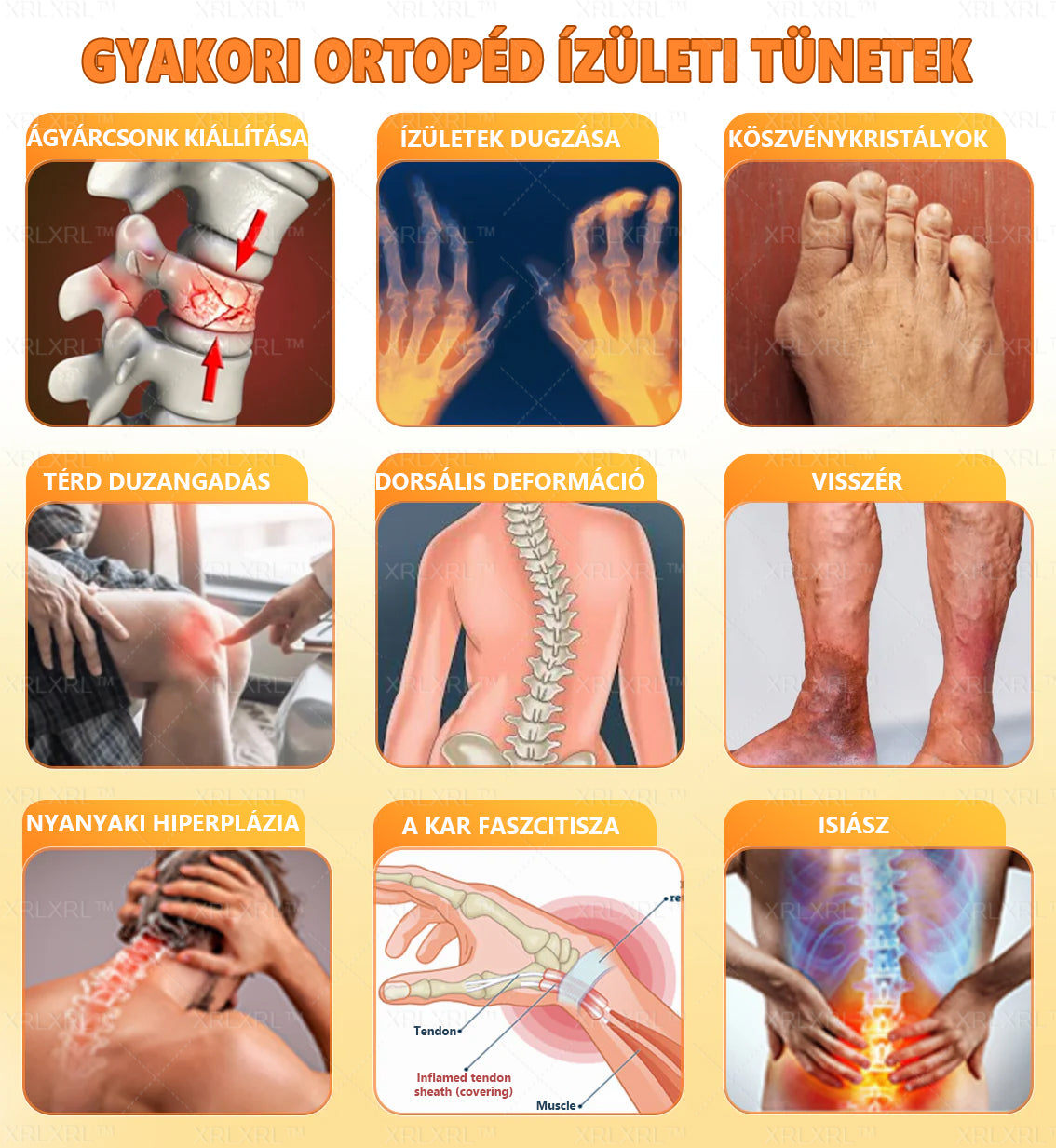 Magában foglalja az osteoarthritiszt, reumás arthritiszt, bursitist, tendinitist, csontritkulást, köszvényt, carpal alagútszindrómát, szalagsérüléseket és rándulásokat, kalapácsujj deformitásokat és teniszalkalmat.