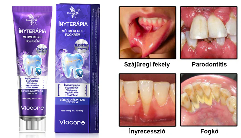 Méhméreg: A méhméreg antibakteriális és gyulladáscsökkentő hatásairól ismert. Segít leküzdeni a szájban lévő baktériumokat és gyulladásokat, miközben elősegíti a szövetek regenerációját.